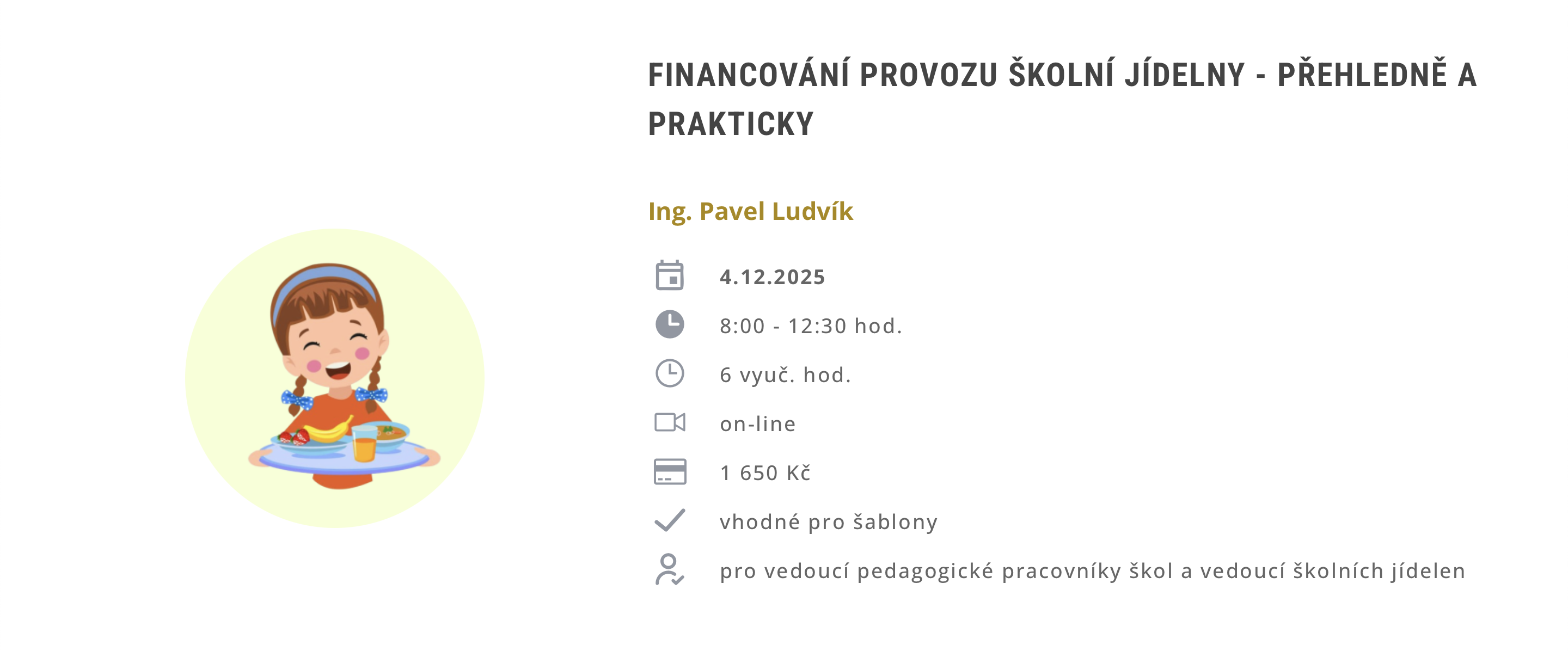 Dozvíte se, co smí a nesmí platit strávník, co můžete chtít od zřizovatele a jak si zkontrolovat správnost platového zařazení. Naučíte se, jak správně sestavit kalkulace ceny, jak postupovat při zdražení stravy nebo jak úsporně hospodařit se stravným.