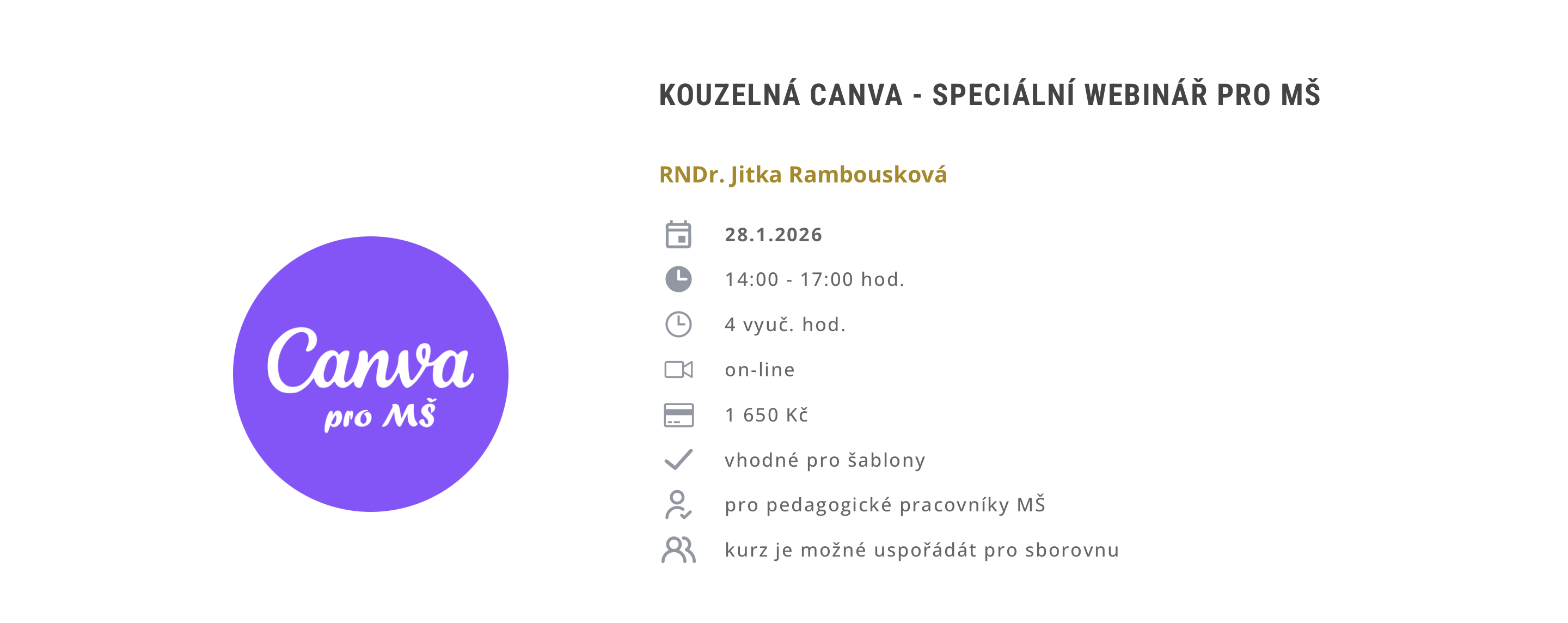 Už jste o ní slyšeli? Canva je úžasná! Chcete se naučit, jak vytvářet atraktivní a neokoukané materiály pro děti? Tvorba vzdělávacích kartiček, pexes, omalovánek, denních rozvrhů, informačních letáků a plakátů, nikdy nebyla jednodušší. S Canvou to zvládne každý hravě, je jednoduchá, zábavná a pro školy zdarma. Nemusíte se obávat práce se složitými grafickými programy.