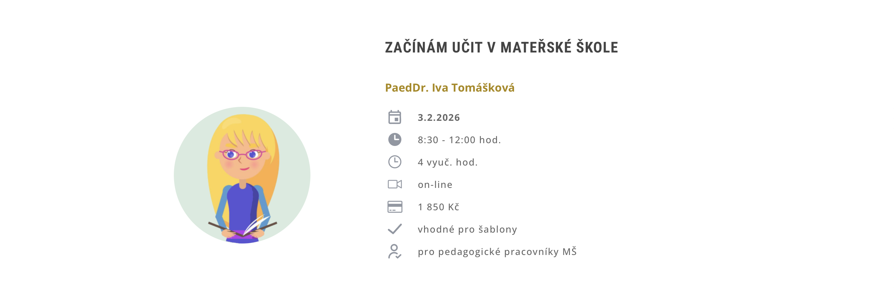 Webinář se bude zabývat tím, co je důležité pro práci učitelky mateřské školy, jak se vypořádat s pedagogickou dokumentací, jak komunikovat s rodiči, jak provádět pedagogickou diagnostiku a hodnocení dětí, jak efektivně nastavit pravidla a jak a proč vést portfolio dětí.