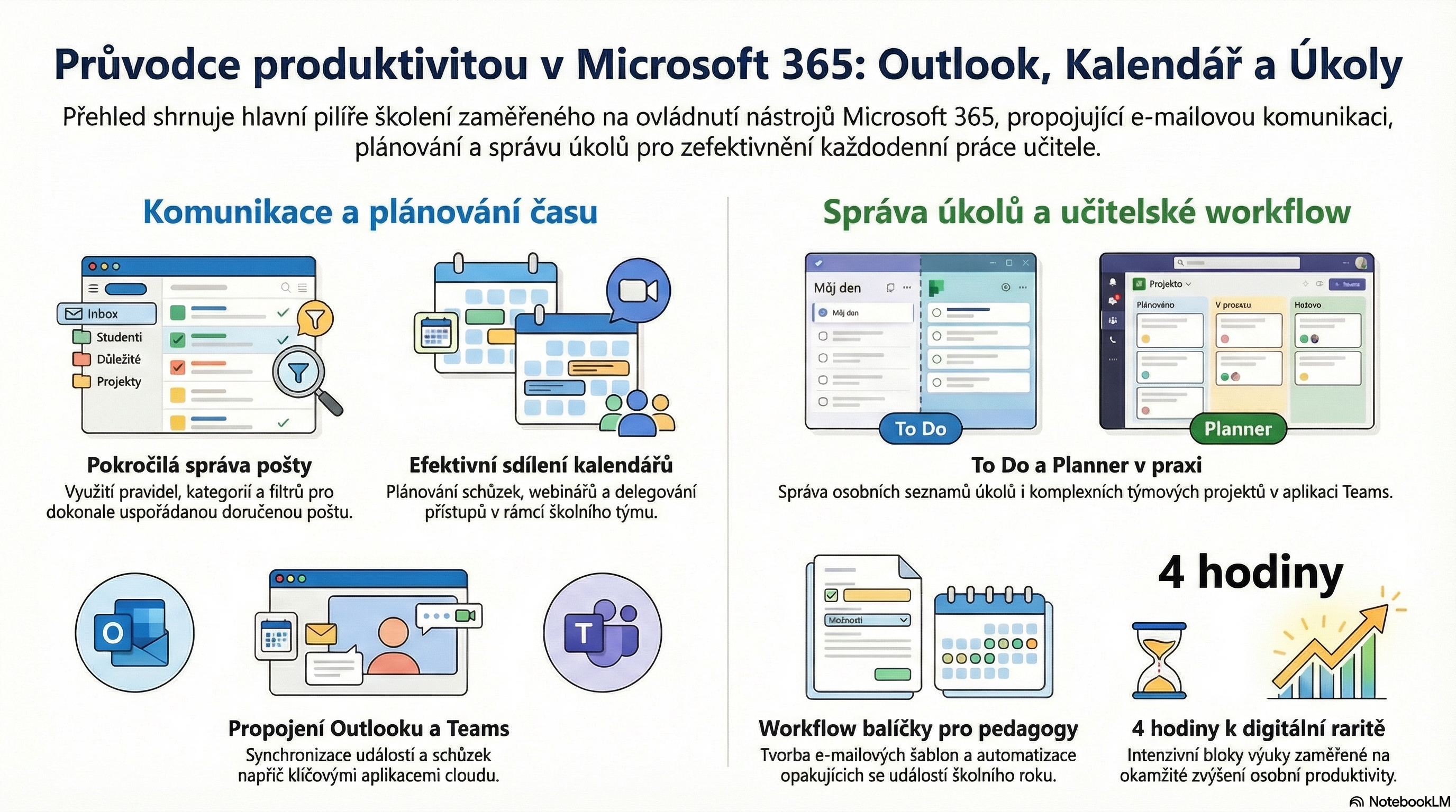 Email, kalendáře, sdílení, plánování schůzek a správa úkolů (To Do / Planner).